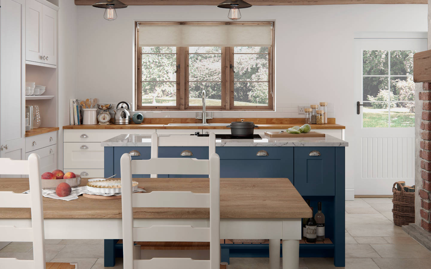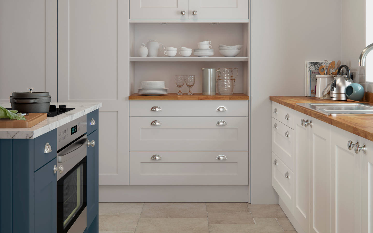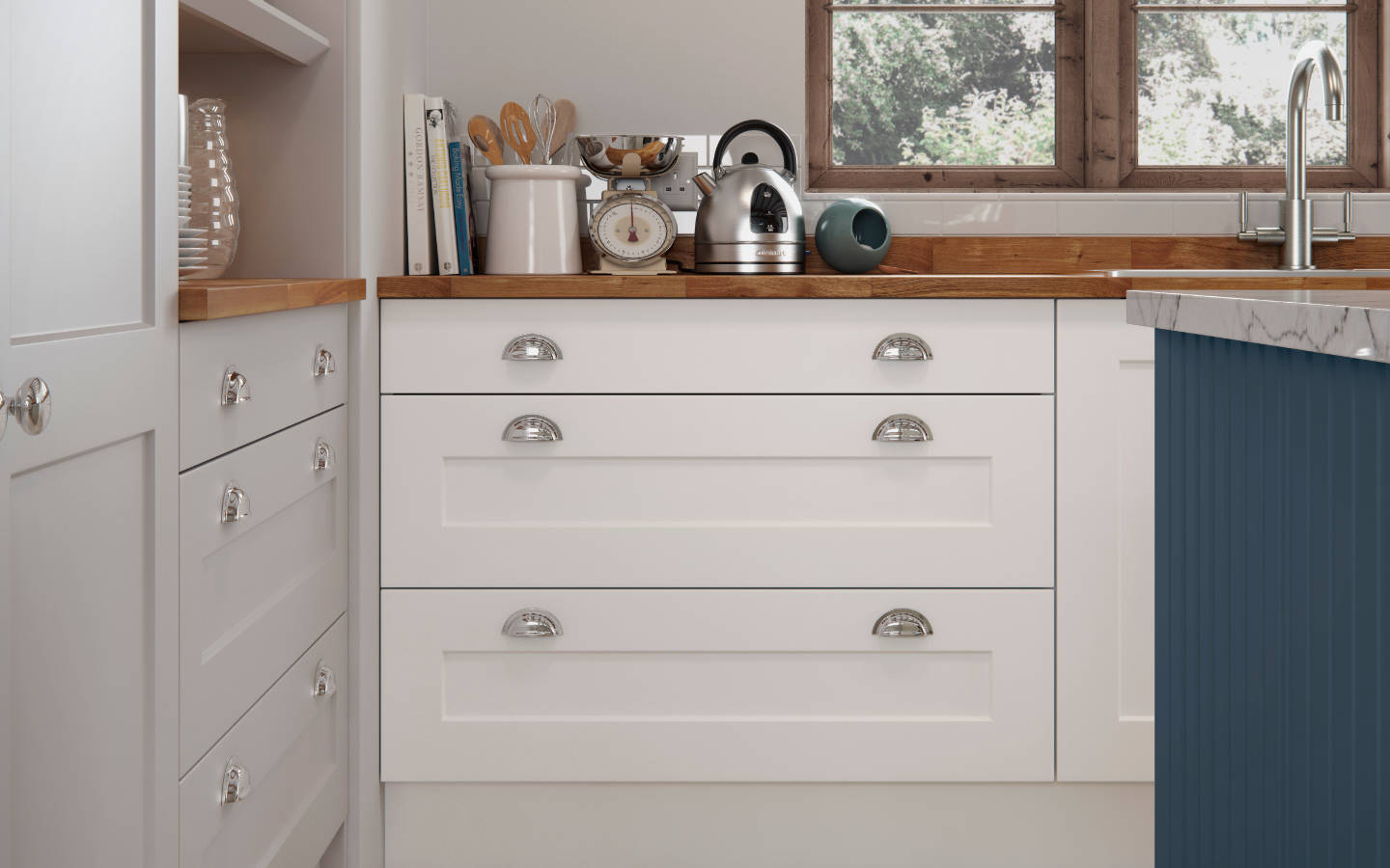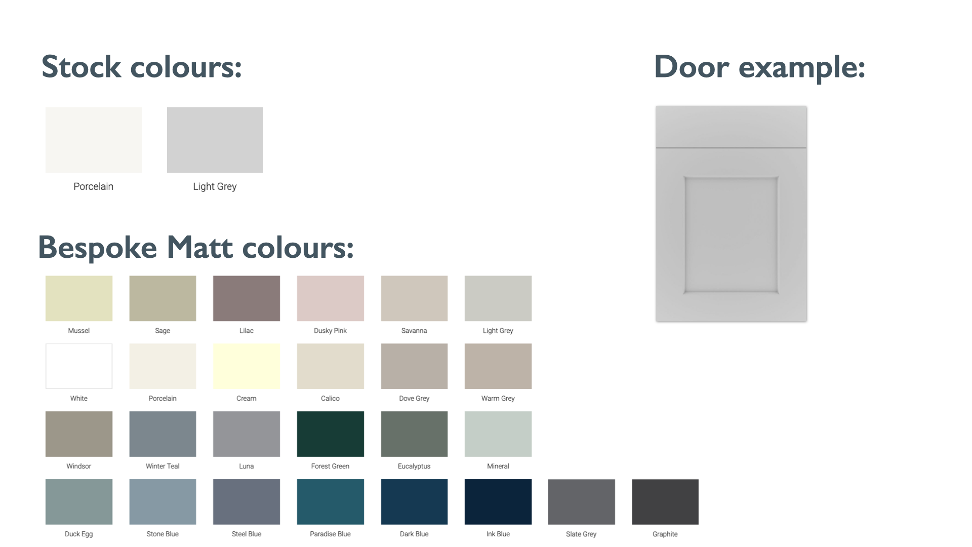 Hartside is a 1 piece MDF shaker door with a smooth painted matt finish. It features a routered centre panel with a deep chamfer and 95mm stiles. Design options include angled end moulds and cornice corner blocks.